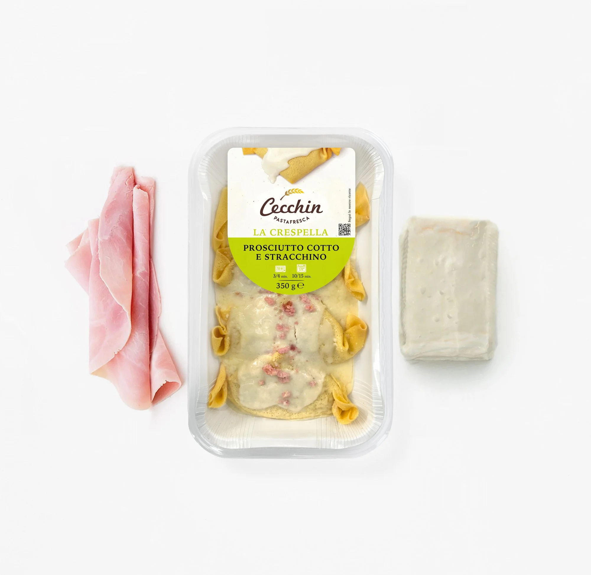 LATTE intero, acqua, prosciutto cotto 15% (carne di suino, sale, destrosio, zucchero, fruttosio, aromi, aromi naturali, spezie), farina di GRANO tenero tipo “00”, formaggio stracchino 7% (LATTE, sale, caglio), UOVA, BURRO, olio di semi di girasole, formaggio Grana Padano DOP (LATTE, sale, caglio, conservante: lisozima da UOVO), sale, formaggio grattugiato (LATTE, sale, caglio, conservante: lisozima da UOVO), noce moscata.